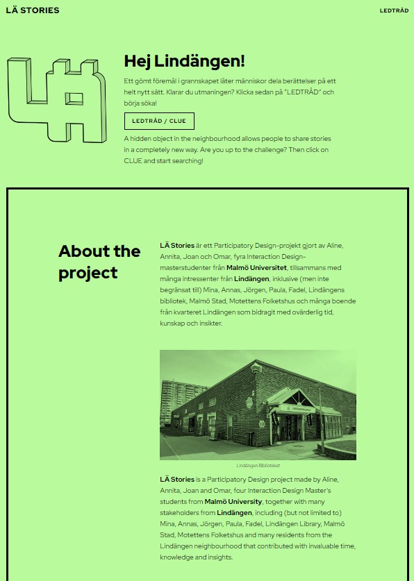 For 9 weeks, we worked using several participatory design methods in close collaboration with the Lindängen community. Observations, interviews, workshops, mockups, a “make kit”, sketches and wireframes were all part of the process. The team, together with Lindängen youth and our stakeholders, came up with a prototype of a system mixing treasure-hunting and story-sharing.
